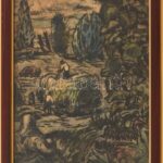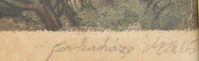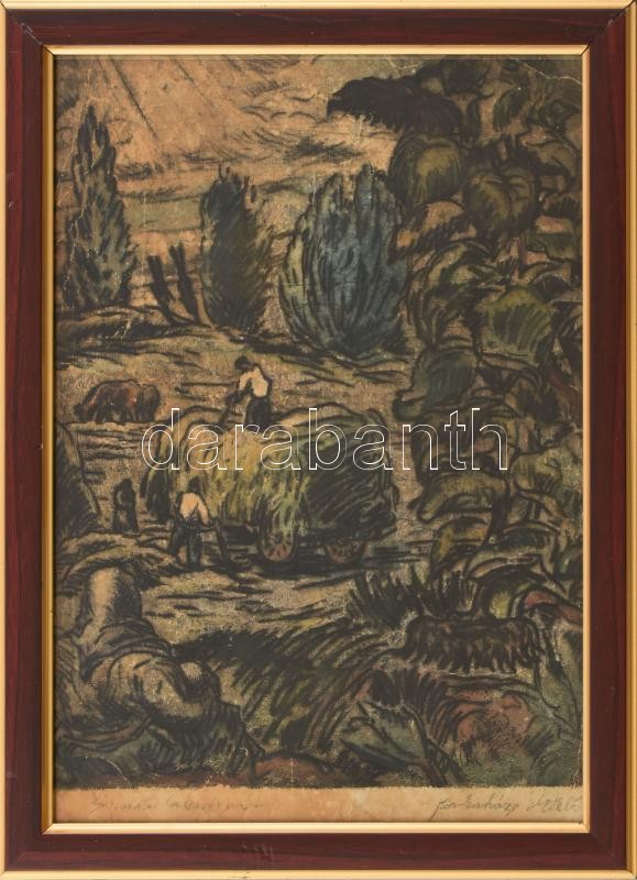 Farkasházy Miklós (1895-1964): Betakarítás. Színezett rézkarc, papír, körbevágott, jelzett, foltos, üvegezett keretben, 27×20 cm<a href="https://www.darabanth.com/hu/gyorsarveres/417/kategoriak~Festmenyek-es-grafikak/Festmenyek-es-grafikak~1/Farkash