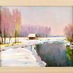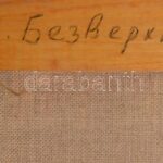 Fedir Pavlovics Bezverkhnev (1918-2005), ukrán festő: Havas táj. Olaj, vászon. Jelzett. Hátoldalán autográf felirattal. Fakeretben. 50×60 cm. / Fedir Pavlovics Bezverkhnev (1918-2005), Ukrainian painter: Snowy landscape. Oil on canvas,