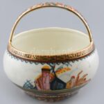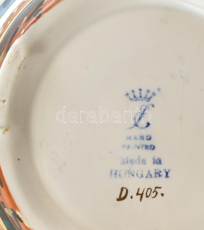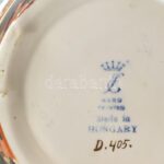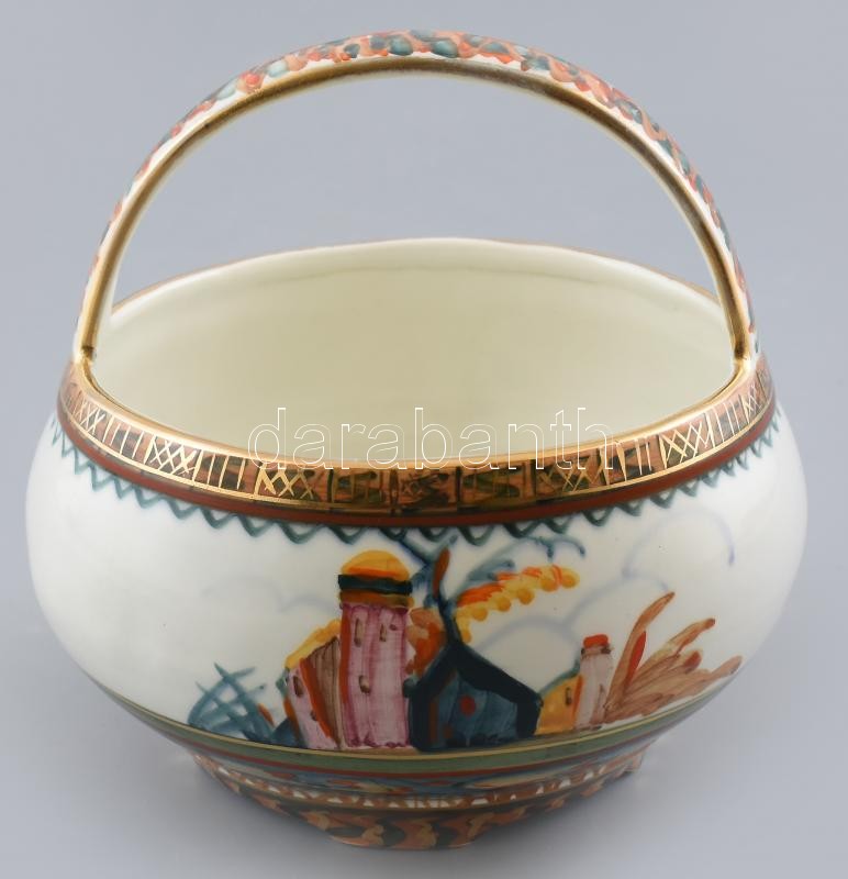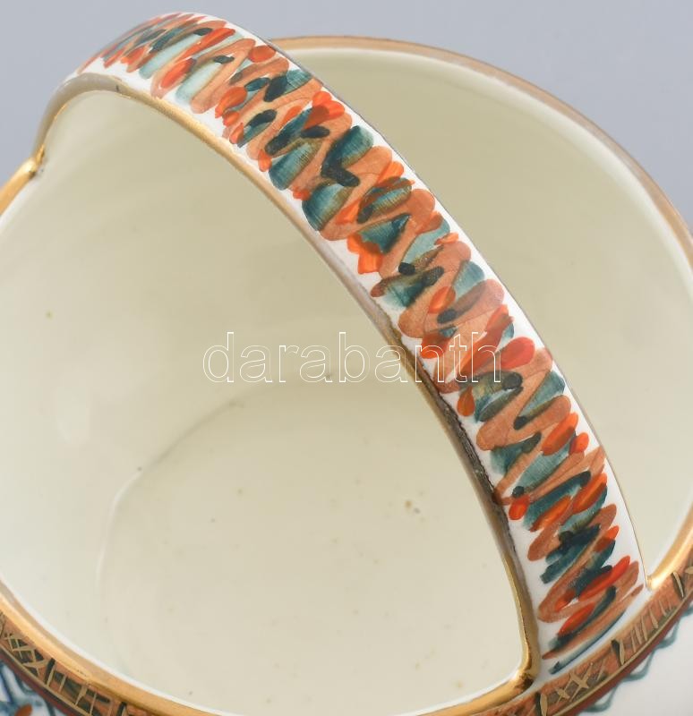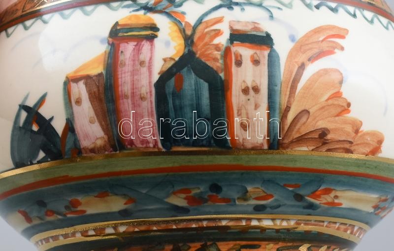 Fischer Emil mázas fajansz kínáló, orientalista díszítéssel, kézzel festett, jelzett, minimális lepattanás a lábán alul (nem látszik) m: 16 cm<a href="https://www.darabanth.com/hu/gyorsarveres/417/kategoriak~Porcelan-keramia-uveg/Porcelan~6/Fischer-