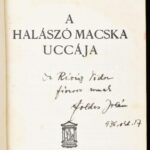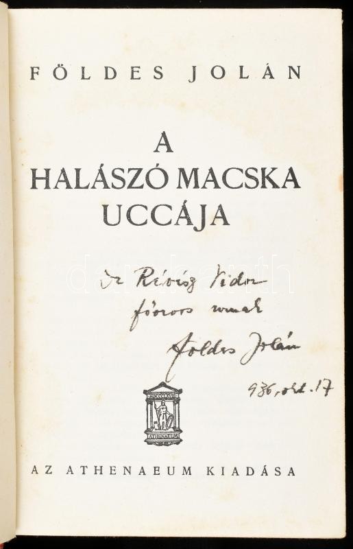 Földes Jolán: A halászó macska uccája. Bp., é.n., Athenaeum, 246 p. Kiadói ezüstözött egészvászon-kötés, helyenként kissé foltos lapokkal, foltos lapszélekkel. A szerző, Földes Jolán (1901-1963) által DEDIKÁLT példány.