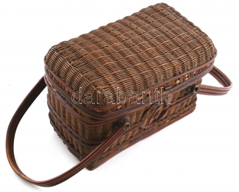 Fonott füles piknikkosár, kopott, sérült, 24x15x16cm
