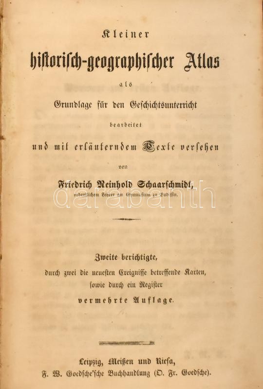 Friedrich Reinhold Schaarschmidt: Kleiner historisch-geographischer Atlas als Grundlage für den Geschichtsunterricht bearbeitet und mit erläuterndem Texte versehen von: – – Leipzig-Meißen-Riesa, 1851., F. W. Goedsche Buchhandlung, IV+96 p.+XXIV