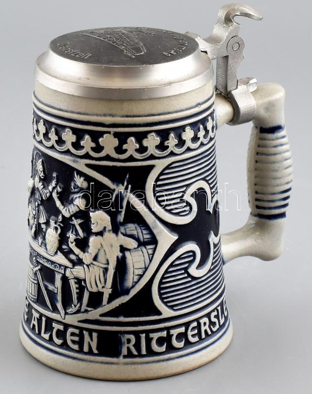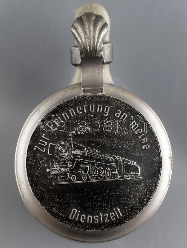 Gerzit német söröskorsó, steinzeug, ón fedél, tetején mozdony relief, jelzett, oldalán kocsma jelenet, kopásnyomokkal, m:16cm<a href="https://www.darabanth.com/hu/gyorsarveres/417/kategoriak~Porcelan-keramia-uveg/Porcelan~6/Gerzit-nemet-soroskorso-s