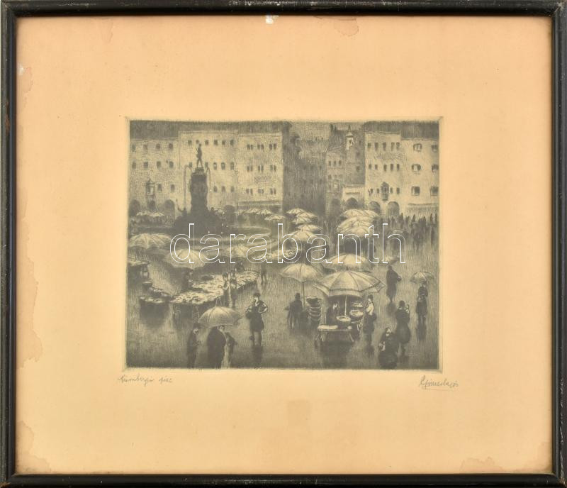 Gimes Lajos (1886-1945): Nürnbergi piac. Rézkarc, papír, jelzett, lap széle foltos, üvegezett fakeretben, 17×23 cm<a href="https://www.darabanth.com/hu/gyorsarveres/435/kategoriak~Festmenyek-es-grafikak/Festmenyek-es-grafikak~500001/Gimes-Lajos-1886