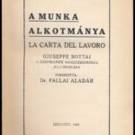 Giuseppe Bottai: A munka alkotmánya. La carta del lavoro. Ford.: Pallai Aladár. Bp., 1929.,Szerzői kiadás,(Gondos-ny.), XXVIII+2+227 p.+1 t. Első magyar nyelvű kiadás. Aranyozott félvászon-kötés, kissé kopott borítóval. Ritka! A könyv szerepel az 1945-b