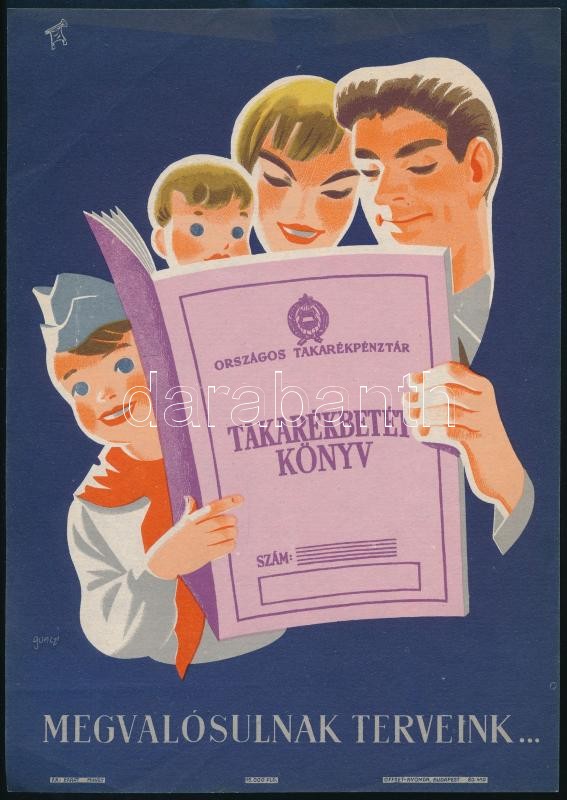 Gönczi-Gebhardt Tibor (1902-1994): Megvalósulnak terveink… Országos Takarékpénztár, takarékbetétkönyv, villamosplakát, 23,5×16,5 cm<a href="https://www.darabanth.com/hu/gyorsarveres/417/kategoriak~Mutargy-papirregiseg-egyeb/Plakat~500003/Gonczi-Ge