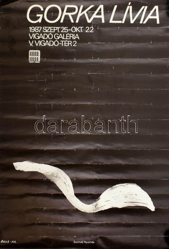 Gorka Lívia kiállítási plakát. 1987. szept. 25-okt. 22. Vigadó Galéria. Feltekerve, törésnyomokkal, 47×69 cm<a href="https://www.darabanth.com/hu/gyorsarveres/417/kategoriak~Mutargy-papirregiseg-egyeb/Plakat~500003/Gorka-Livia-kiallitasi-plakat-1987
