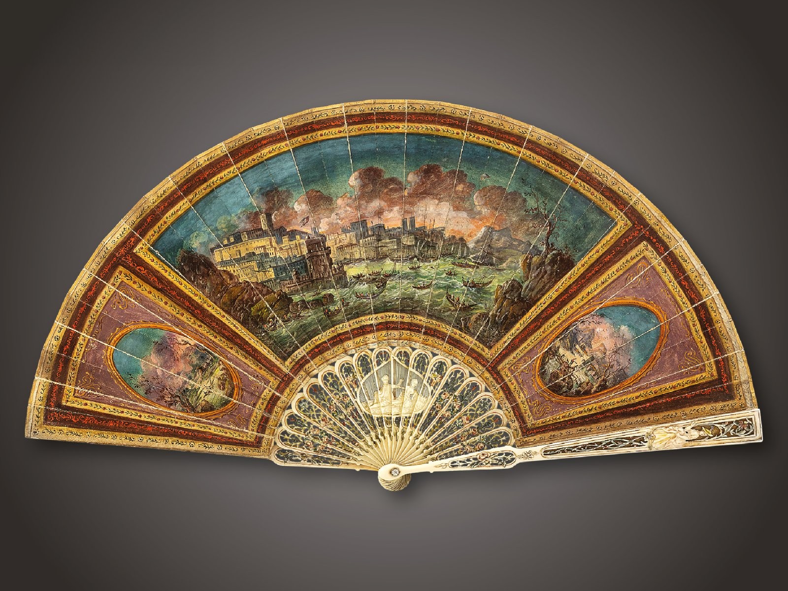 Grand Tour legyező Festett vellum guache, faragott és festett, csont küllőkkel. A küllők aprólékos, áttört közeiben faragott és festett rózsák és rózsakoszorúk , középen gáláns udvarlási jelenet látható,a záróküllőin korabeli ruhát és kalapot viselő nő