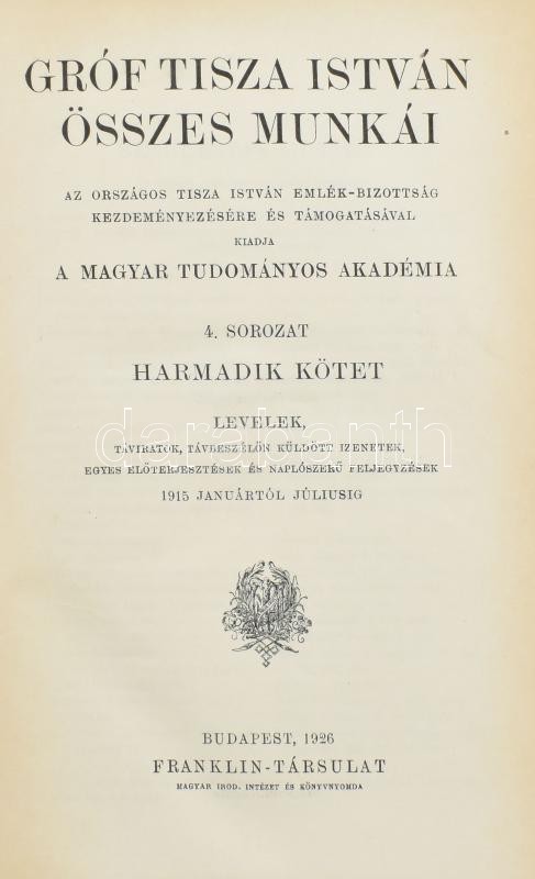 Gróf Tisza István összes munkái 4. sorozat II.-III. kötet. Levelek, táviratok, távbeszélőn küldött izenetek és egyes előterjesztések az 1914-1915 évekből. Bp.,1924-26, Franklin-Társulat, Kiadói félvászon-kötés,<a href="https://www.darabanth.com/hu/g