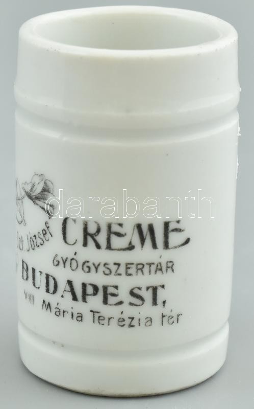 Gyógyszeres tégely, porcelán, Szt. József gyógyszertár, Creme, kopott, m: 6cm<a href="https://www.darabanth.com/hu/gyorsarveres/410/kategoriak~Mutargy-papirregiseg-egyeb/Bolhapiac~500015/Gyogyszeres-tegely-porcelan-Szt-Jozsef-gyogyszertar-Creme-kopo
