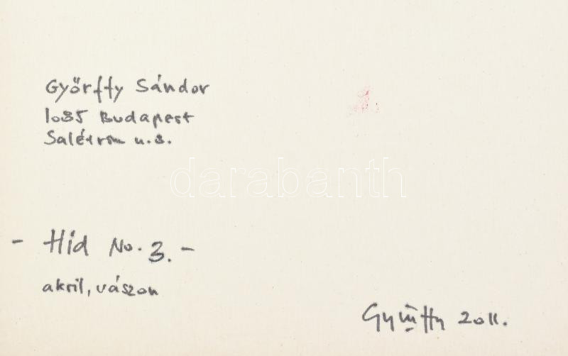 Győrffy Sándor (1951-): Híd No. 3, 2011. Akril, vászon, jelzett a hátoldalán. Reprodukálva: Győrffy Sándor: A csend pillanata. Festmények 1987-2013. H.n., Muravidék Baráti Kör Kulturális Egyesület, 2014, 124. oldal. 60×60 cm.