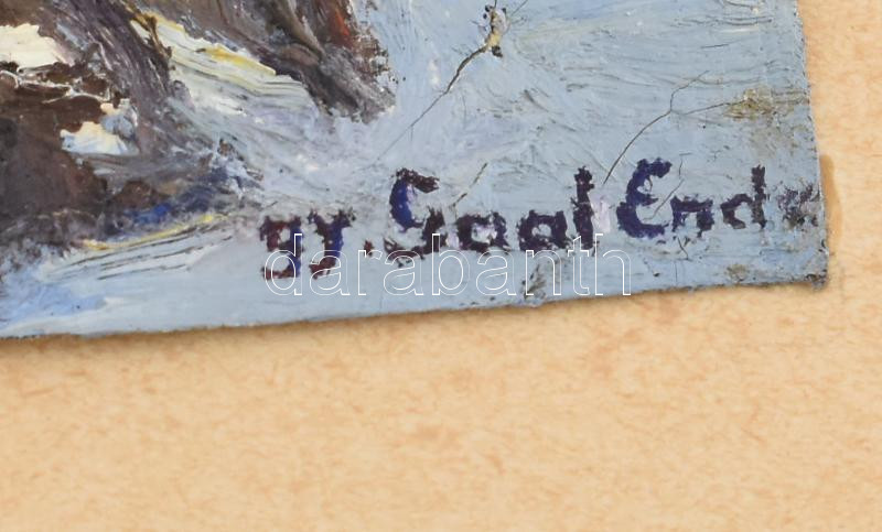 Gyulai Gaál Endre (1904-1991): Levelibéka. Olaj, vászon-karton, jelzett, 20×25 cm Hátoldalán a festő autográf verses sorai: ‘Festettem ezt a képet halk, borongó Kedvvel tűnődve egy mély rébuszon : Hogy van e élet, vagy ahhoz hasonló Kívül e szerencsétlen