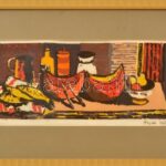 Hajdú Katalin (1932-): Csendélet. Linómetszet, papír, jelzett. Lap alja kissé foltos. Üvegezett fa keretben, 17×40 cm<a href="https://www.darabanth.com/hu/gyorsarveres/426/kategoriak~Festmenyek-es-grafikak/Festmenyek-es-grafikak~500001/Hajdu-Katalin
