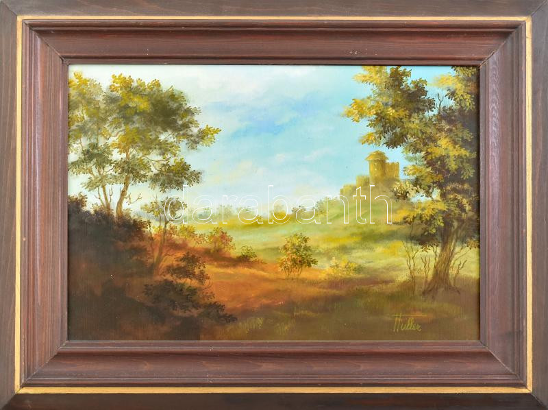 Haller Géza: Távoli vár. Olaj, rétegelt falemez. Dekoratív keretben. 27x38cm<a href="https://www.darabanth.com/hu/gyorsarveres/431/kategoriak~Festmenyek-es-grafikak/Festmenyek-es-grafikak~5000002/Haller-Geza-Tavoli-var-Olaj-retegelt-falemez-Dekorati