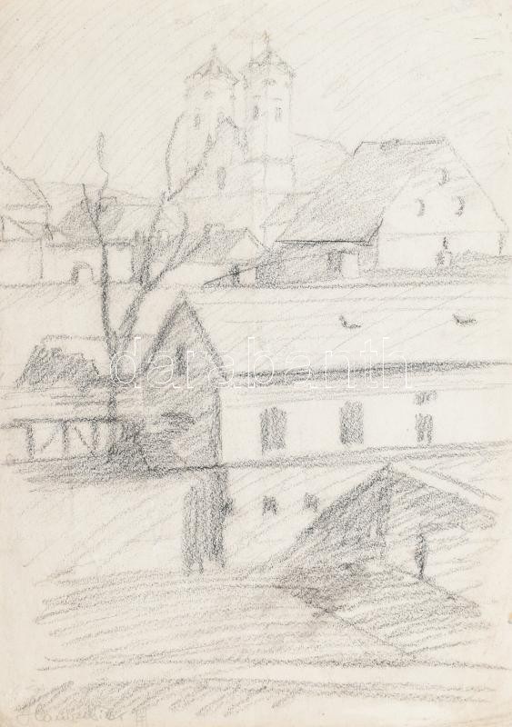 Hamza Tibor (1908-1972): Városi panoráma (Eger v. Gyöngyös?). Szén, papír, jelzett, lap széle kissé sérült. 42,5×30 cm<a href="https://www.darabanth.com/hu/gyorsarveres/420/kategoriak~Festmenyek-es-grafikak/Festmenyek-es-grafikak~500001/Hamza-Tibor-