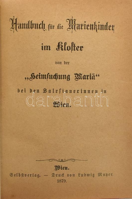 Handbuch für die Marienkinder im Kloster von der ‘Heimsuchung Mariä’ bei den Salesianerinnen in Wien. Wien, 1879, Ludwig Mayer, 1 t. + 459+(3) p. Német nyelven. Aranyozott, bordázott gerincű egészbőr-kötés, festett lapélekkel, kissé kopott borítóval és ge
