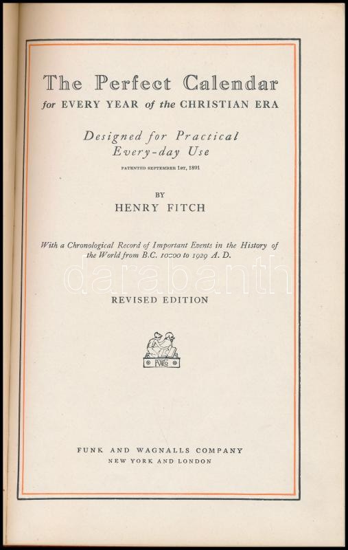 Henry Fitch: The Perfect Calendar for Every Year of the Christian Era. Designed for Practical Every-day Use. New York-London, 1928, Funk and Wagnalls Company. Egészvászon kötésben, kissé kopott borítóval, de egyébként jó állapotban. Angol nyelven.<a