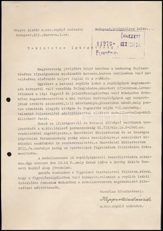 Heppes Aladár (1904-1988) magyar vadászpilóta levele az ifjúság nevelésével kapcsolatban, saját kezű aláírásával<a href="https://www.darabanth.com/hu/gyorsarveres/417/kategoriak~Mutargy-papirregiseg-egyeb/Militaria~29/Heppes-Aladar-1904-1988-magyar-