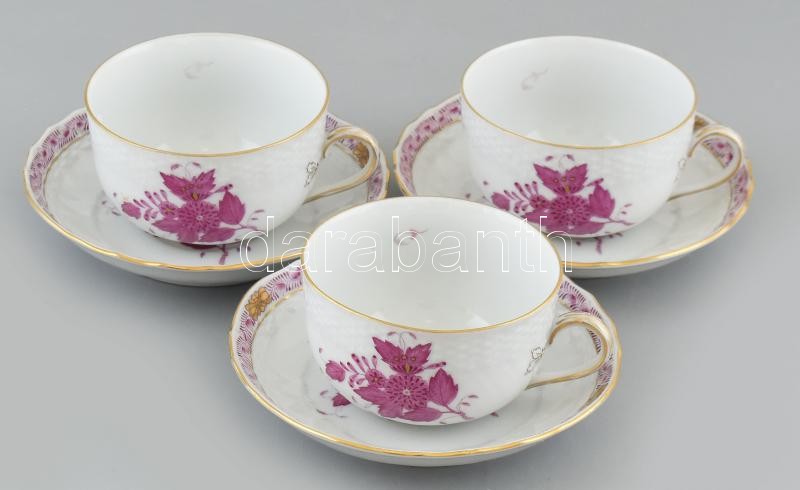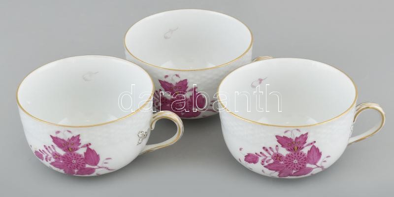 Herendi purpur Apponyi teás csésze aljjal, 3db, kézzel festett, kopásnyomokkal, jelzett.