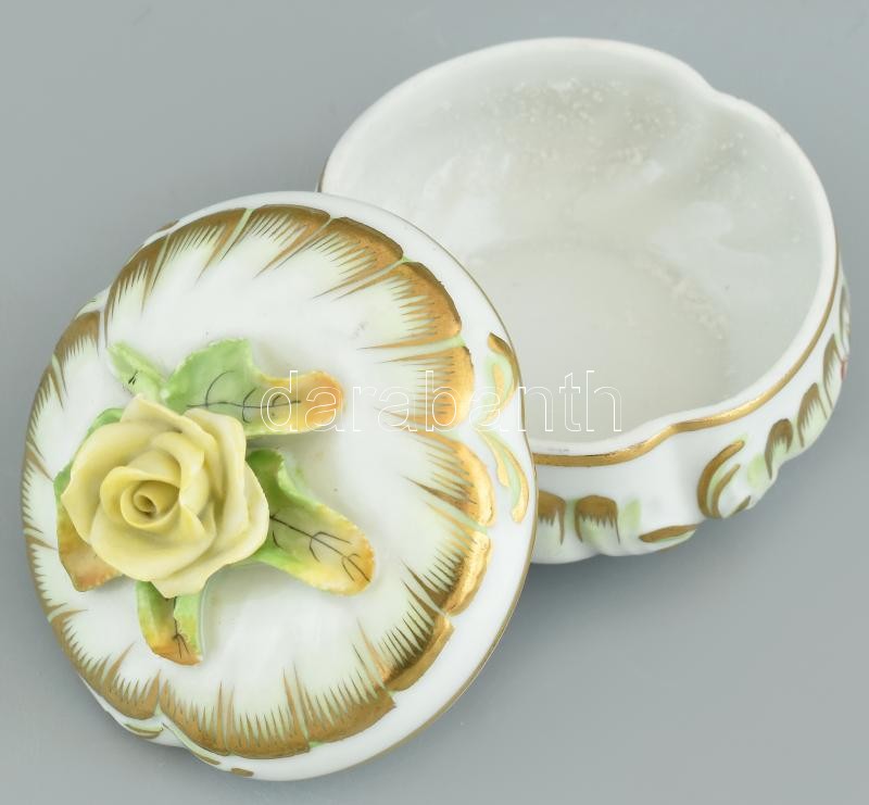 Herendi Viktória mintás bonbonniere rózsás fedéllel Kézzel festett, jelzett, rózsákon apró lepattanás, kopásnyomokkal. d: 8 cm<a href="https://www.darabanth.com/hu/gyorsarveres/421/kategoriak~Porcelan-keramia-uveg/Porcelan~500006/Herendi-Viktoria-mi