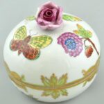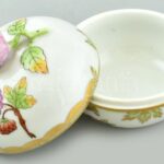 Herendi Viktória mintás porcleán bonbonniere, rózsával. Mini csorbával a rózsán, mázrepedéssel. Kézzel festett, jelzett. d: 7,5 cm<a href="https://www.darabanth.com/hu/gyorsarveres/415/kategoriak~Porcelan-keramia-uveg/Porcelan~500006/Herendi-Viktori