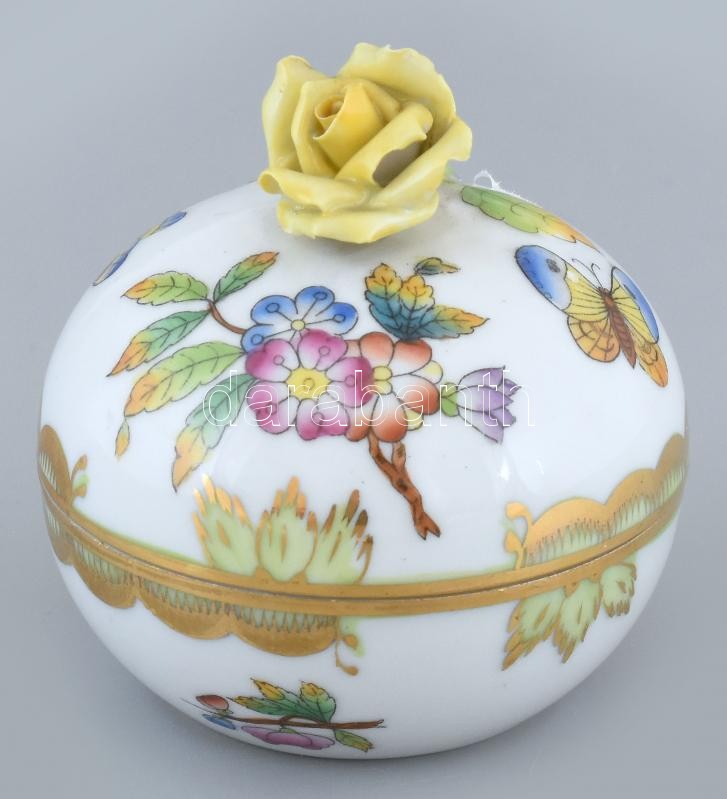 Herendi Viktória mintás rózsás bonbonier, kézzel festett porcelán, apró lepattanások a rózsán, jelzett, m:8cm, d:7,5cm<a href="https://www.darabanth.com/hu/gyorsarveres/416/kategoriak~Porcelan-keramia-uveg/Porcelan~500006/Herendi-Viktoria-mintas-roz
