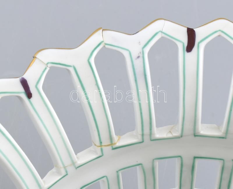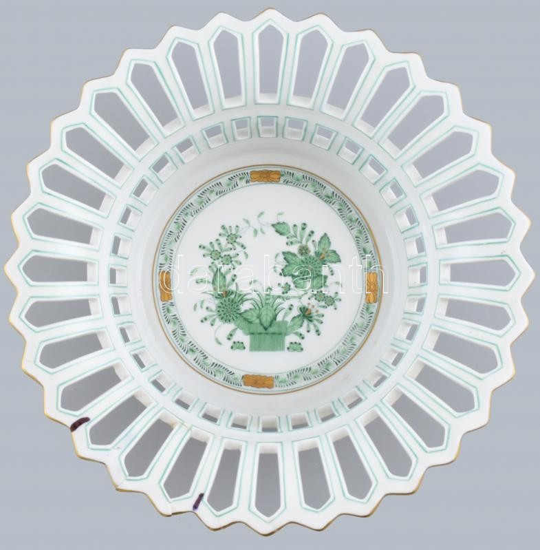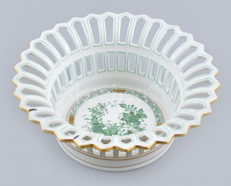 Herendi zöld indiai kosár mintás, áttört óriás porcelán kínálótál. Kézzel festett, jelzett, ragasztott. D: 23,5 cm, m: 9 cm<a href="https://www.darabanth.com/hu/gyorsarveres/417/kategoriak~Porcelan-keramia-uveg/Porcelan~6/Herendi-zold-indiai-kosar-m
