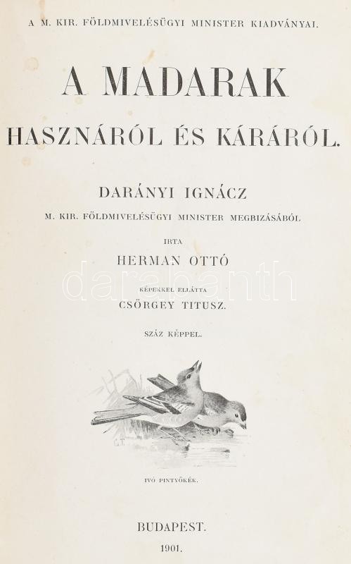 Hermann Ottó: A madarak hasznáról és káráról. Csörgey Titusz képeivel. Bp., 1901., (Franklin-ny.), 279+1 p. Első kiadás. Átkötött félvászon-kötésben, javított kötéssel, kissé foltos lapokkal, ceruzás aláhúzásokkal, bejegyzésekkel, a címkép sarkán kis hián