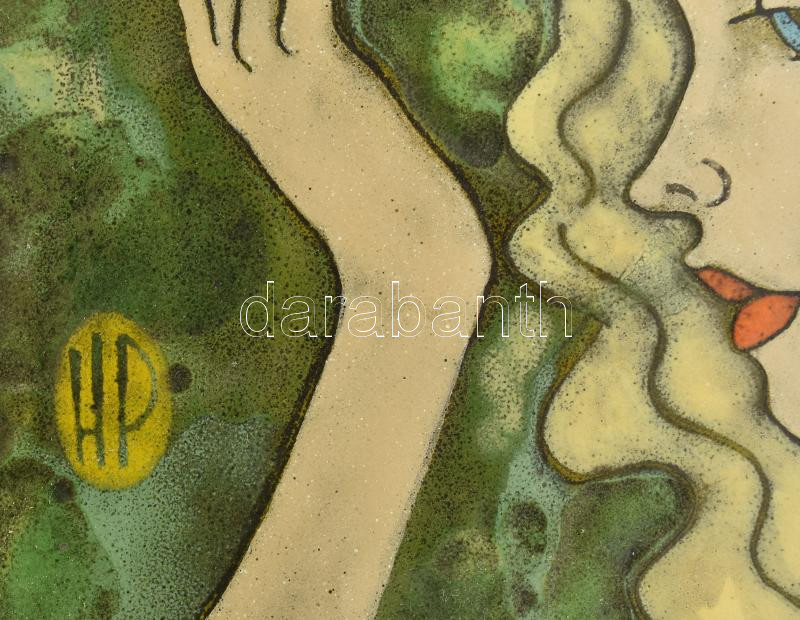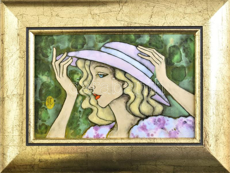 Hernádi Paula (1947-): Rózsaszín kalapos lány. Tűzzománc, jelzett, fa keretben, 13×20 cm<a href="https://www.darabanth.com/hu/gyorsarveres/435/kategoriak~Festmenyek-es-grafikak/Festmenyek-es-grafikak~500001/Hernadi-Paula-1947-Rozsaszin-kalapos-lany-