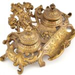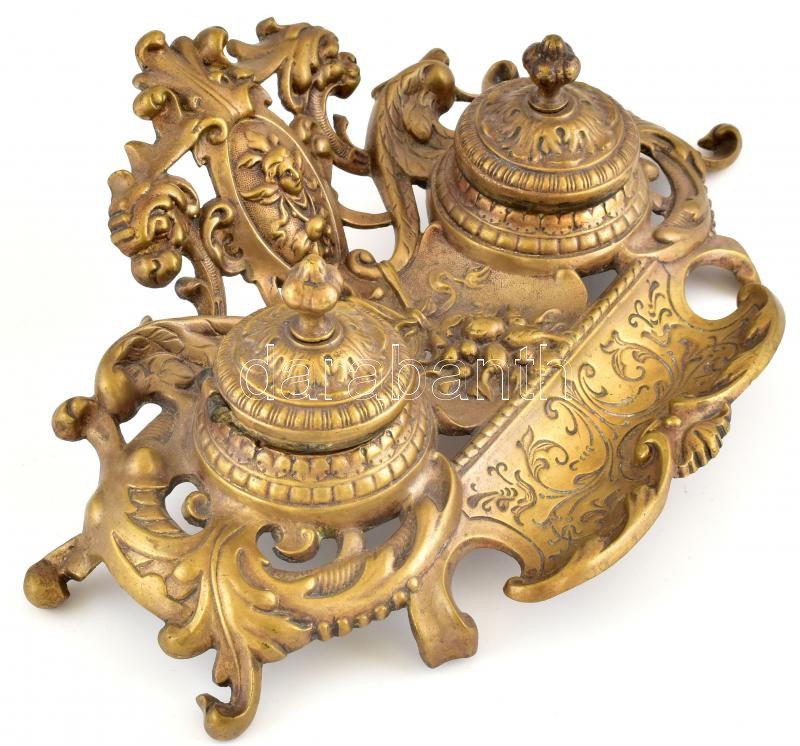 Historizáló bronz asztali tintatartó, 2 db üvegbetéttel, alján formaszámmal, apró kopásnyomokkal, 9,5x31x20 cm<a href="https://www.darabanth.com/hu/gyorsarveres/413/kategoriak~Mutargy-papirregiseg-egyeb/Mutargyak-antikvitas~500008/Historizalo-bronz-