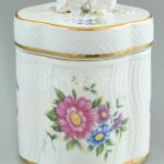 Hollóházi Alba Regia mintás teafű tartó fedeles edény, matricás porcelán, kopott, rózsákon és belső szájperemén csorbák, jelzett, m: 11,5cm<a href="https://www.darabanth.com/hu/gyorsarveres/410/kategoriak~Porcelan-keramia-uveg/Porcelan~500006/Holloh
