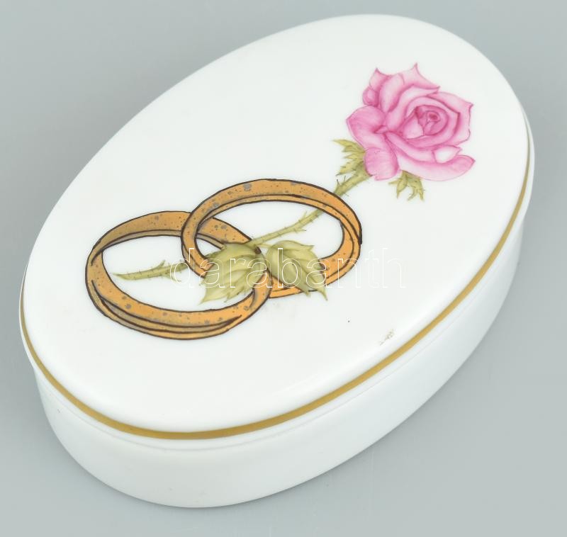 Hollóházi gyűrűtartó bonbonniere, matricás porcelán, jelzett, kopott. 9x6cm