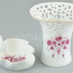 Hollóházi porcelán váza m:12cm, tálka 14x11cm. Matricás, jelzett, kopásnyomokkal.<a href="https://www.darabanth.com/hu/gyorsarveres/412/kategoriak~Porcelan-keramia-uveg/Porcelan~500006/Hollohazi-porcelan-vaza-m12cm-talka-14x11cm-Matricas-jelzett-kop