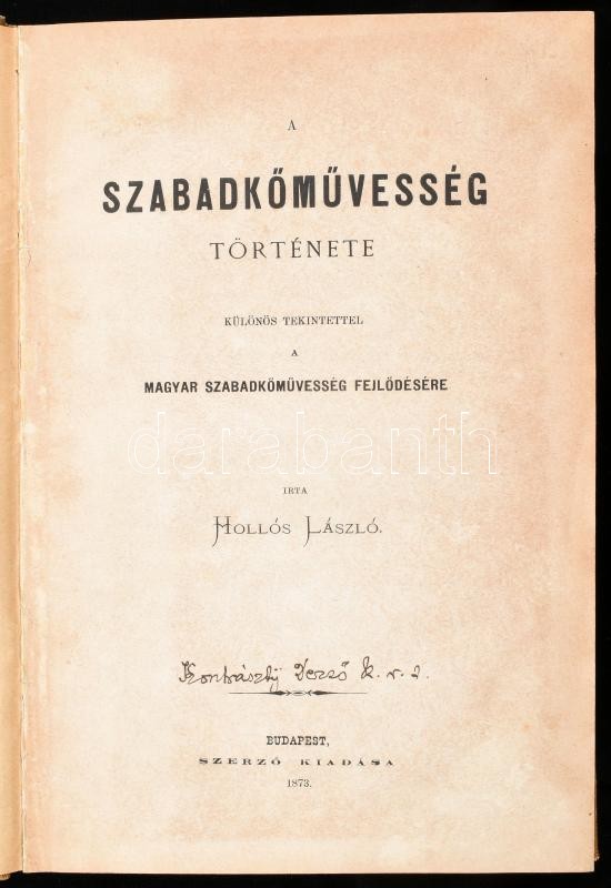 Hollós László: A szabadkőművesség története. Különös tekintettel a magyar szabadkőművesség fejlődésére. Bp., 1873, a szerző kiadása (Wilckens Gy. ny.), 105+(2) p. Könyvkötői félvászon-kötés (Nemzeti Sajtóvállalat Könyv- és Papírkereskedése, Szeged kötése)