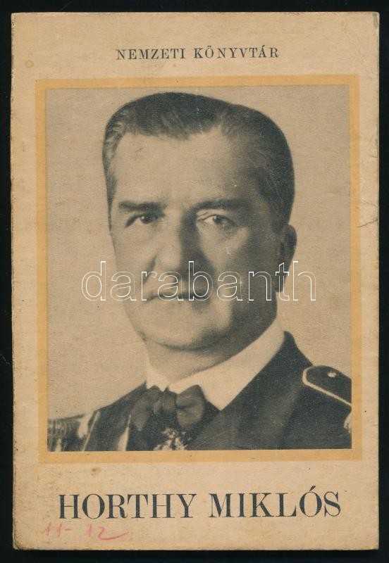 Horthy Miklós. Nemzeti Könyvtár. Bp., 1940., Stádium, 79+1 p.+4 (kétoldalas fekete-fehér fotók) t. Első kiadás. Kiadói papírkötés, kissé foltos, kissé szakadt borítóval.<a href="https://www.darabanth.com/hu/gyorsarveres/412/kategoriak~Konyvek/Konyve