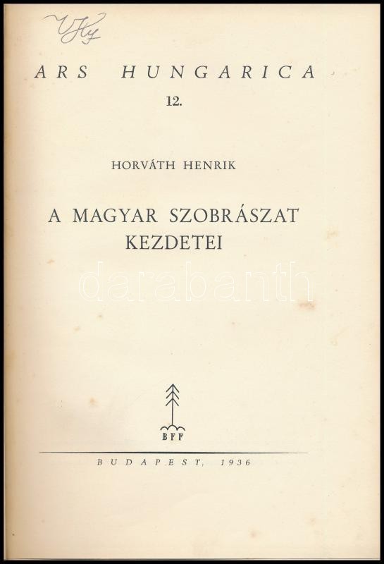 Horváth Henrik: A magyar szobrászat kezdetei. Ars Hungarica 12. Szerk.: (Oltványi)-Ártinger Imre. Bp., 1936, Bisztrai Farkas Ferenc,(Maretich-ny.), 32 p.+32 (fekete-fehér képtáblák) t.+2 p. Kiadói kissé kopott festett egészvászon-kötés, foltos.<a hr