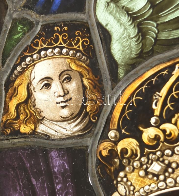 I. Ferdinánd császár és Jagelló Anna császárnő esküvőjének emlékére festett ólomüveg ablak, dísz. Osztrák császári címert tartó angyalokkal. 1518-as évszámmal. Sérült 26×44 cm / Marriage of Emperor Ferdinand and Anna Jagello. Lead glass ornament with Habs