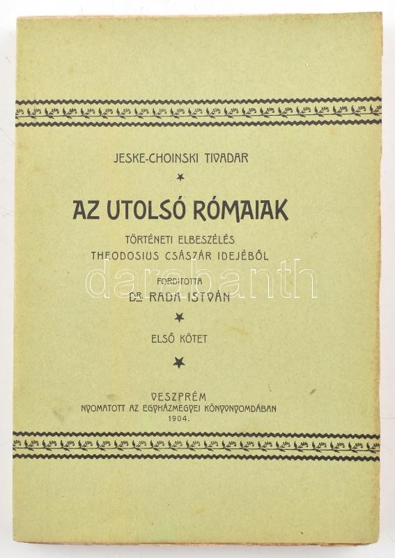 Jeske-Choinski Tivadar: Az utolsó rómaiak. I. köt. Történeti elbeszélés Theodosius császár idejéből. Ford.: Dr. Rada István. Veszprém, 1903, Egyházmegyei Könyvnyomda, 338 p. A borítón 1904-es, a címlapon 1903-as évszámmal.) Kiadói papírkötés, kissé foltos