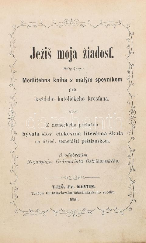 Jezis moja ziadost. Modlitebná kniha s malym spevníkom pre kazdého katolickeho krestana. [Szlovák nyelvű katolikus imakönyv, énekeskönyv.] Turc. Sv. Martin (Turócszentmárton), 1881, Tlacou kníhtlaciarsko-úcastinárskeho spolku, 391+(8) p. + 3 t. Szlovák ny