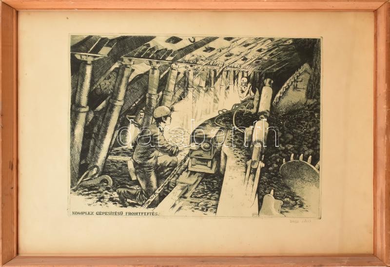 Jurida Károly jelzéssel: Komplex gépesítésű frontfejtés. Rézkarc, papír. Üvegezett, kissé sérült fakeretben. 29×39 cm<a href="https://www.darabanth.com/hu/gyorsarveres/416/kategoriak~Festmenyek-es-grafikak/Festmenyek-es-grafikak-jelzessel-jelzes-nel