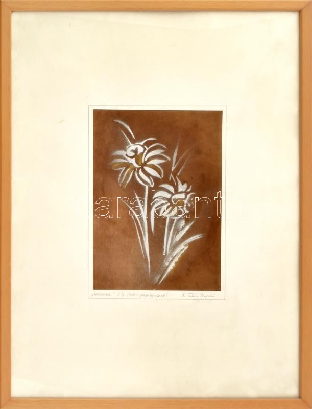 K. Takács Magdolna (?-): Nárciszok. Papírmetszet, papír, jelzett, számozott: 5/4. 23×15 cm. Üvegezett fakeretben.<a href="https://www.darabanth.com/hu/gyorsarveres/436/kategoriak~Festmenyek-es-grafikak/Festmenyek-es-grafikak~500001/K-Takacs-Magdolna