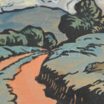 Kádár Béla (1877-1956): Táj. Akvarell, papír, jelzés nélkül, hátoldalán a Művészház 1912. évi töredékes kiállítási raglapjával. Művészház nyereményjátékán elnyert alkotás. Fakeretben. 24×32 cm