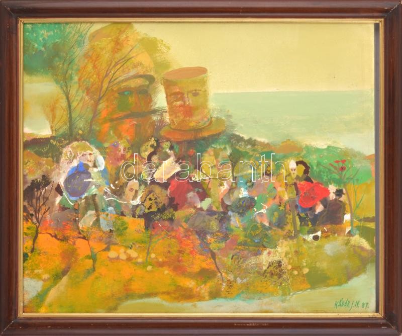 Kádár János Miklós (1939-): Bolondok szigete. Olaj, farost, jelezve jobbra lent, hátoldalán autográf felirattal, fakeretben. 50×60 cm / oil on fibre board, signed lower right, with autograph description on the reverse, framed<a href="https://www.da