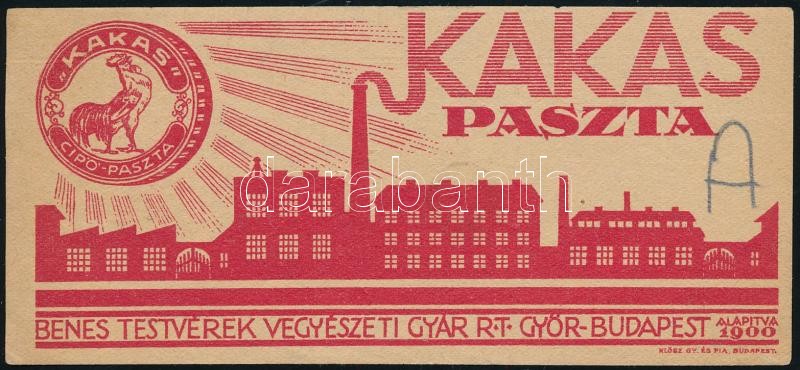 Kakas paszta (Benes Testvérek Vegyészeti Gyár Győr) számolócédula<a href="https://www.darabanth.com/hu/gyorsarveres/412/kategoriak~Mutargy-papirregiseg-egyeb/Reklam~500022/Kakas-paszta-Benes-Testverek-Vegyeszeti-Gyar-Gyor-szamolocedula~II2570548/?ut