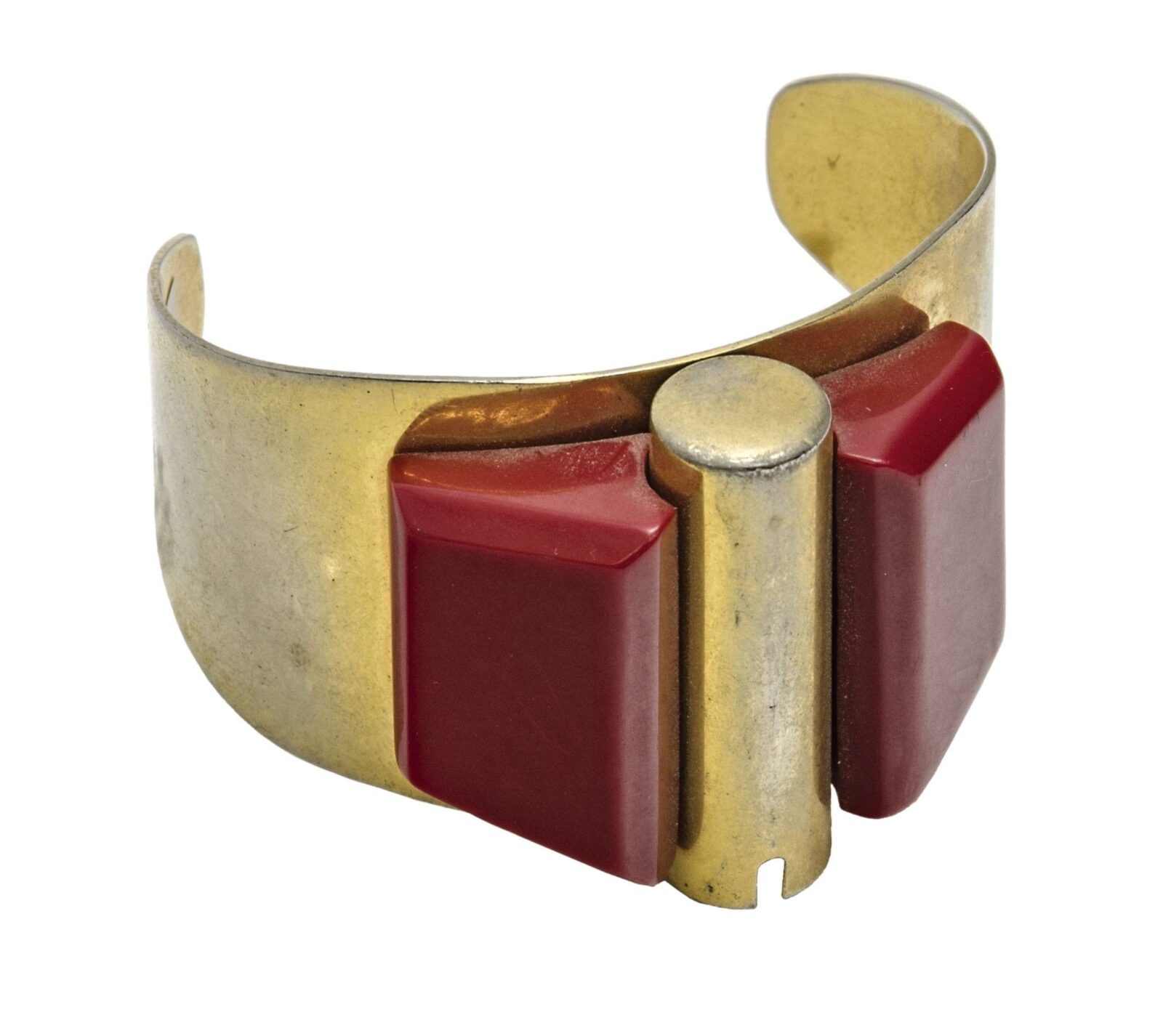 francia, 1930 körül, Albert Flamand terve alapján, Flamand Deposé jelzéssel, sárgaréz, műanyag, rúzstartó résszel, hiányos, d: 6,5 cm