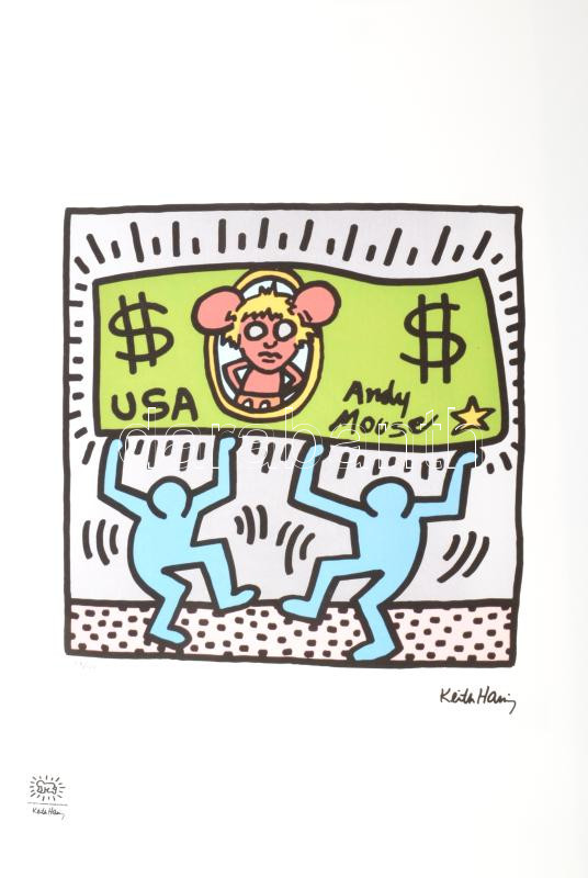 Keith Haring (1958-1990): Andy Mouse. Ofszet – lito papír, jelzett a nyomaton. Számozott: 117 /150. Keith Haring Foundation szárazpecséttel jelzett. Tanúsítvánnyal. Képméret 33×42 cm, Lapméret: 70×50 cm / Numbered, marked 70×50 cm<a href="https://ww