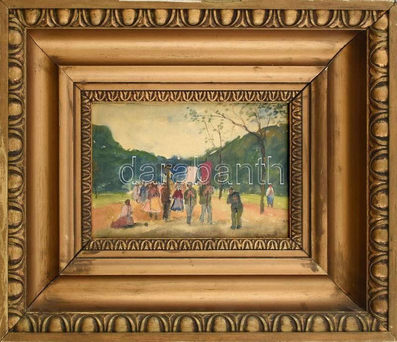 Kernstok Károly (1873 – 1940): Búcsú. Akvarell, papír. 16×24 cm. Jelzett: Kernstok. Hátoldalán MNG bírálati etikett: 1607/972. A bírálat szerint Kernstok Károly színvázlata. Korabeli sérült üvegezett keretben. ‘A ‘Világ’ 1917. október 21-i számában Bölöni