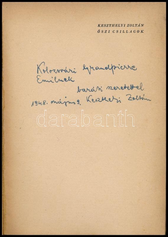 ![Keszthelyi Zoltán: Őszi csillagok. Válogatott versek. [Bp., 1948], Budapest Székesfővárosi Irodalmi Intézet. Kiadói papírkötés, szakadt, foltos borítóval, javított kötéssel. A szerző, Keszthelyi Zoltán (1909-1974) háromszoros](https://mutargy.com/wp-content/uploads/2025/01/2537322.jpg)