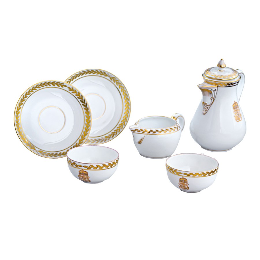 Herend és Hüttl Tivadar jelzettel, Budapest, 19. sz. vége, 2 db csészealj későbbi kiegészítés a Herendi gyártól, festett, aranyozott porcelán, koronás FJ monogrammal, Ferenc József budavári %, készletéből, kiöntő :szalagos Herend, kancsó és egy csésze zöl