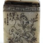 Kínai, faragott kő pecsétnyomó, rajta faragott Dai Zong. 4,5x3x1,8 cm. Dai Zong a kínai irodalom négy nagy klasszikus regényének, a Vízparti történet egyik szereplője. A 108 Liangshan-hős közül a 36 égi szellem közül a 20. helyen áll, és a ‘Mágikus utazó’